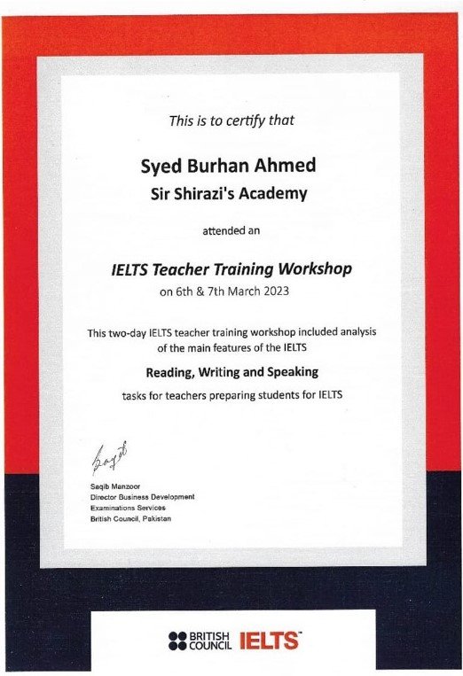 "My Overall experience was excellent. Sir Burhan is a Very dedicated and hardworking teacher, the guidance he gave me for my IELTS exam helped me alot. Highly recommended."